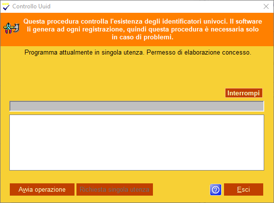 Questa funzione richiede la singola utenza per poter operare (ad eccezione dei casi in cui DataDomus lancia automaticamente questa funzione). Fino a quando tutti gli altri operatori non eseguono il logout non sarà possibile avviare l'operazione (pulsante Avvia operazione disabilitato). In questo caso si può sfruttare la messaggistica interna di DataDomus premendo il pulsante Richiesta singola utenza i cui dettagli sono in comune con tutte le altre funzioni che necessitano la singola utenza. Vedere Compattazione archivi per i dettagli della messaggistica comune.